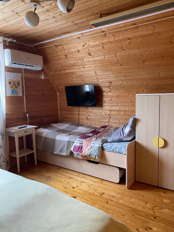 2 этаж: 2 спальных комнаты (3+3 спальных места), рабочее место в общей зоне.