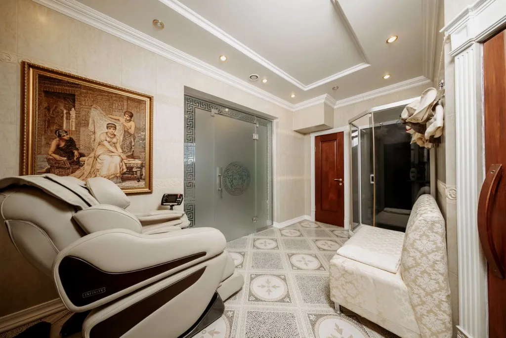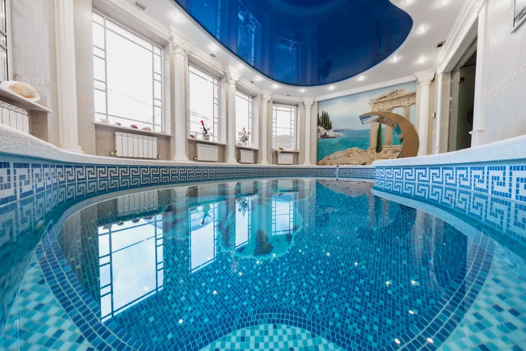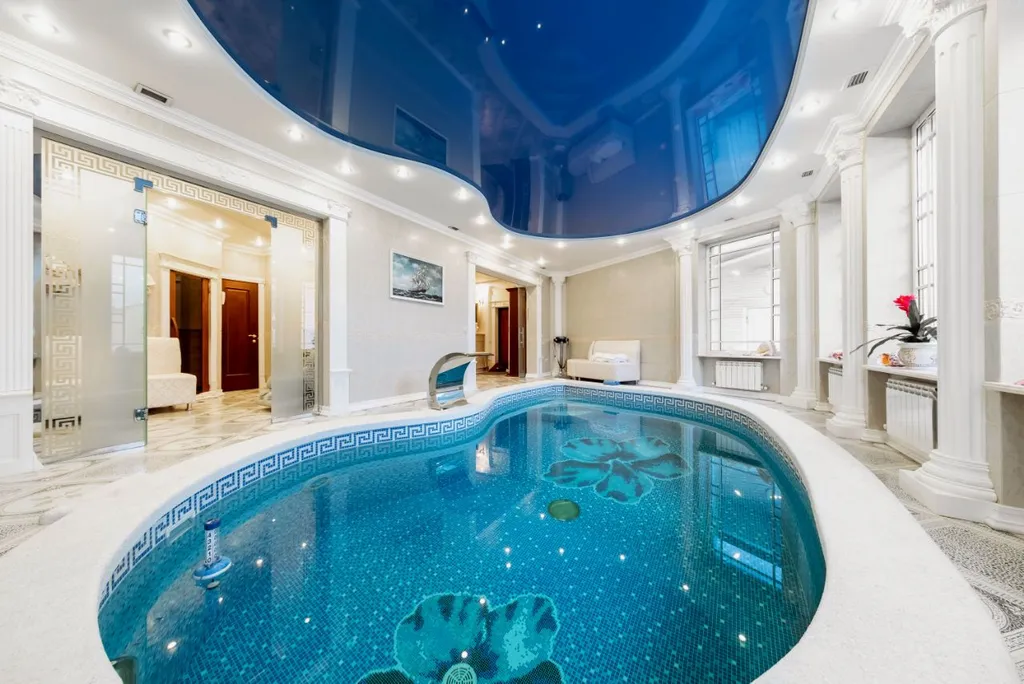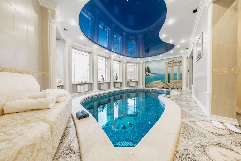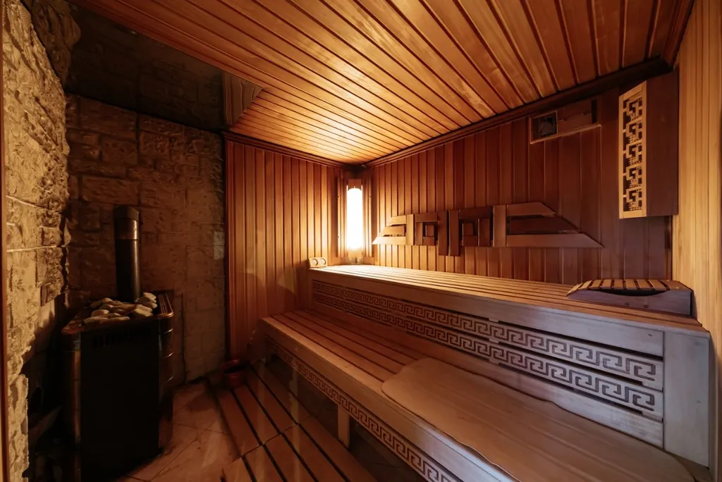 На первом этаже сауна на дровах с жаркой парилкой и бассейном с постоянной температурой 29с. Бассейн крытый, работает противоток (очень полезно для спины, а так же делает каждый ваш заплыв более интересным)