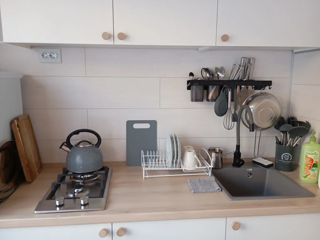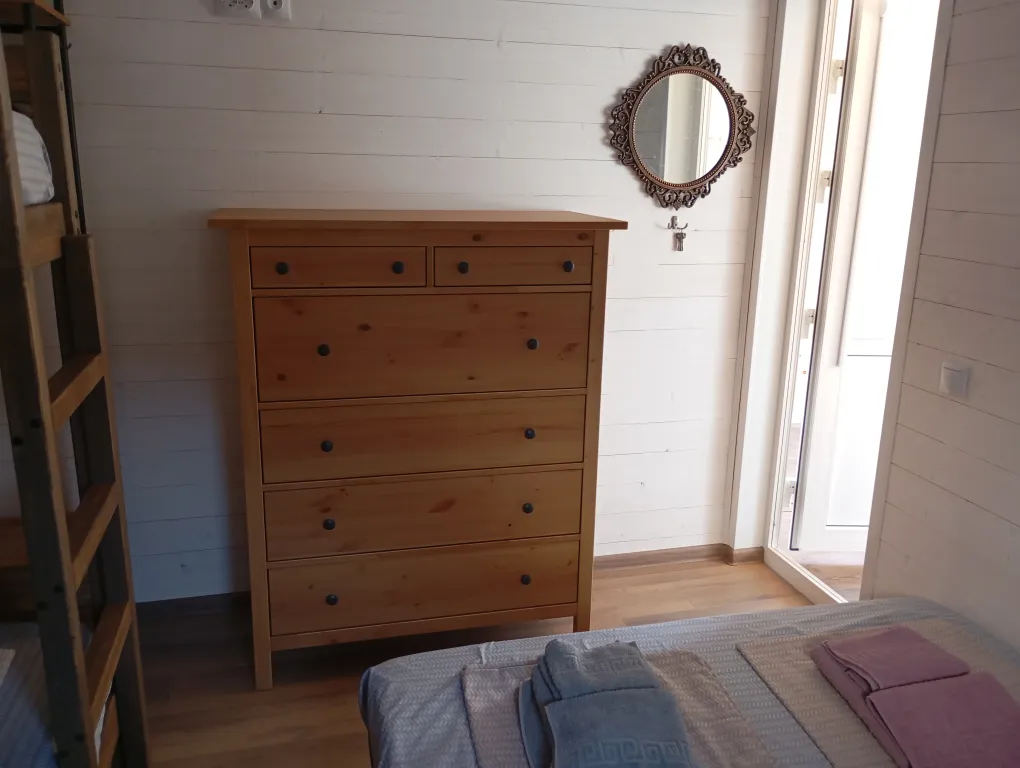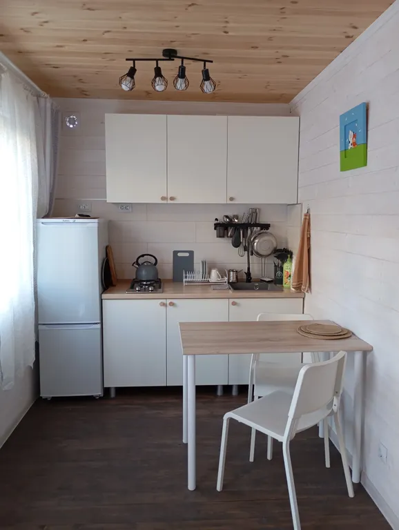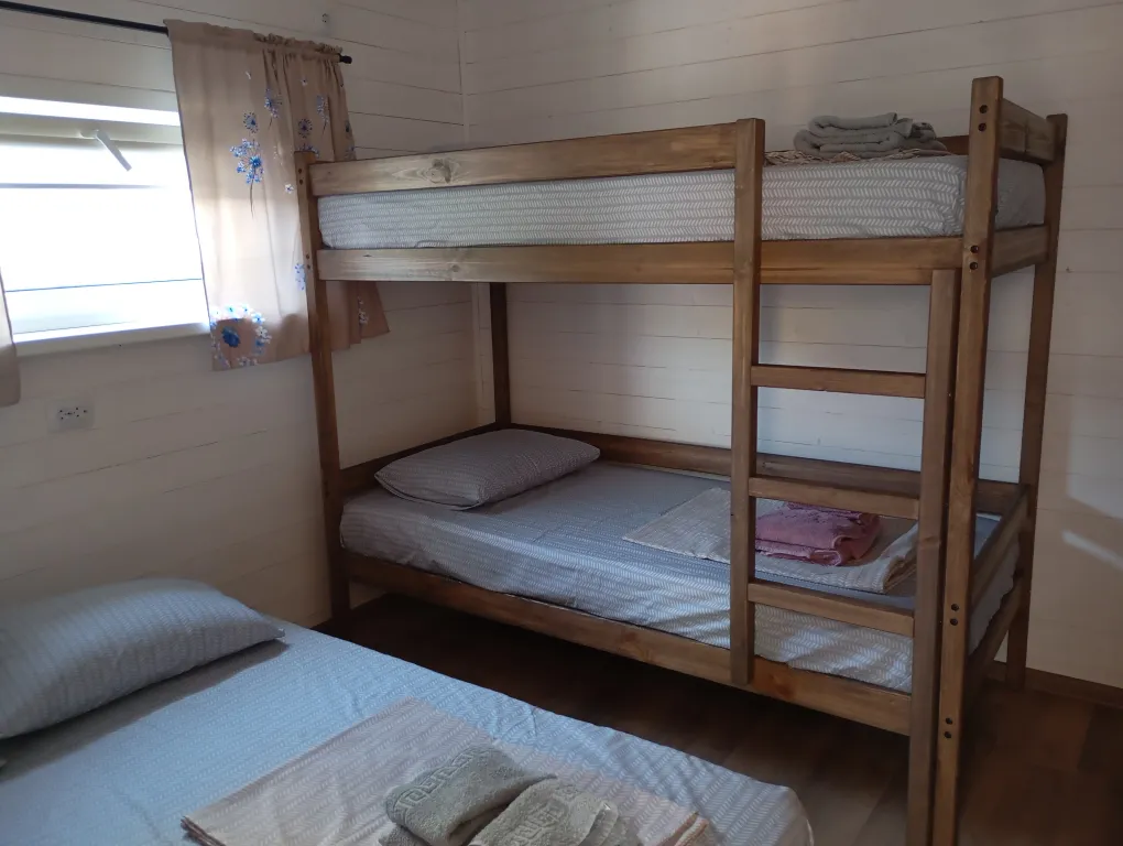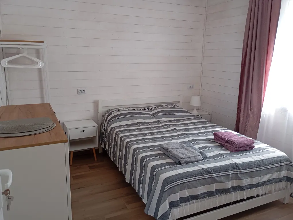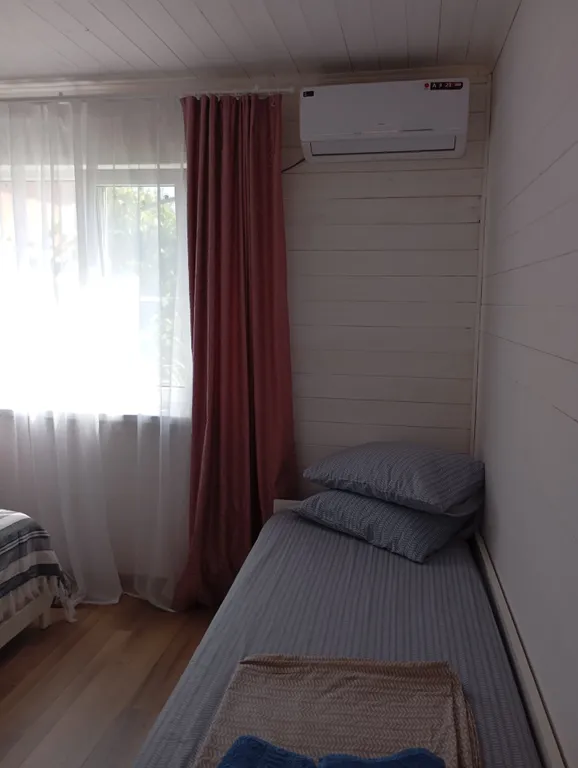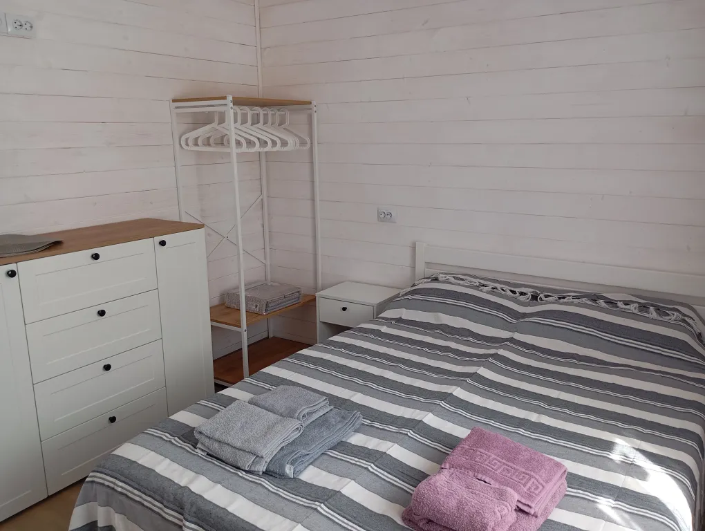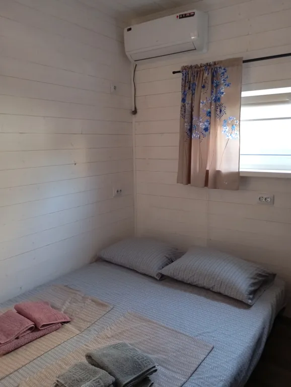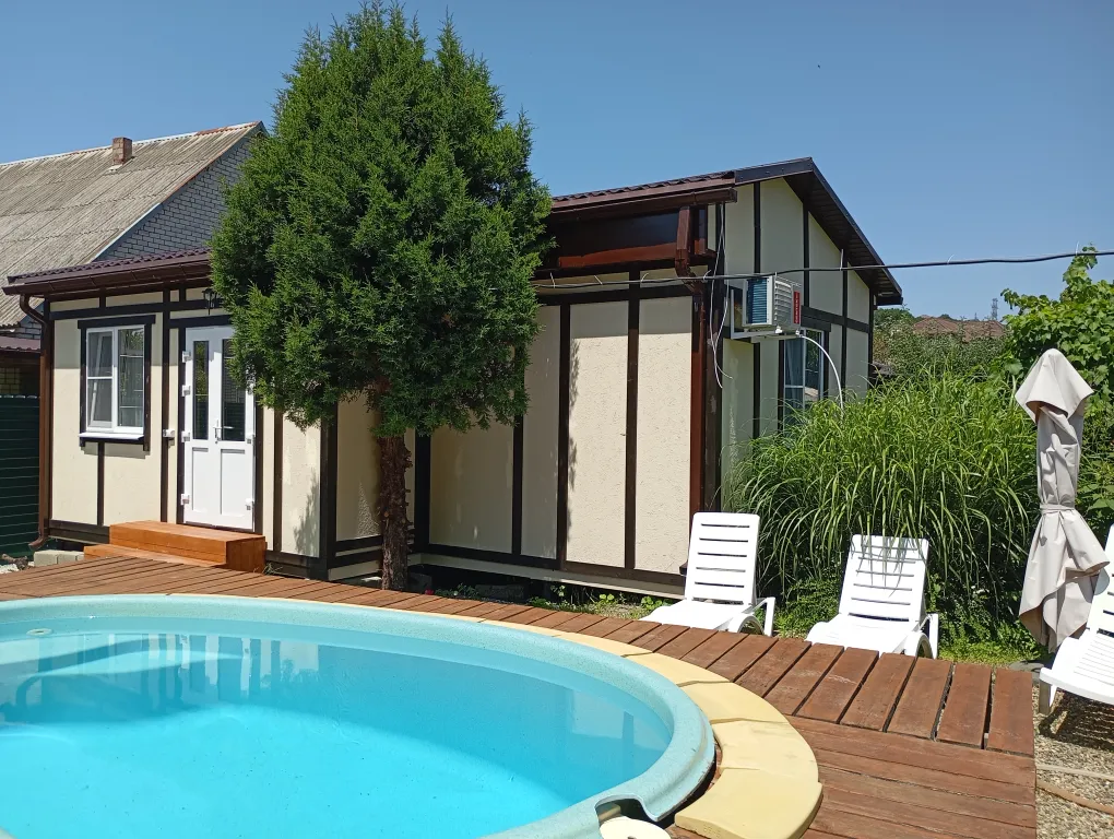Гости могут сами готовить на оборудованной кухне. На территории есть места для отдыха, мангал, бассейн, детская площадка, батут. Перед домом на улице расположена парковка. В домике в каждой комнате кондиционер, телевизор. Общий на 2 комнаты санузел, холодильник.