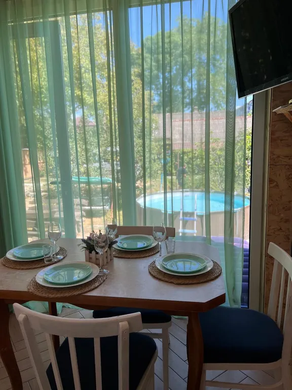 Возле домика расположен бассейн (d- 3. 60, h - 1. 20), мангал и большой стол со скамейками.