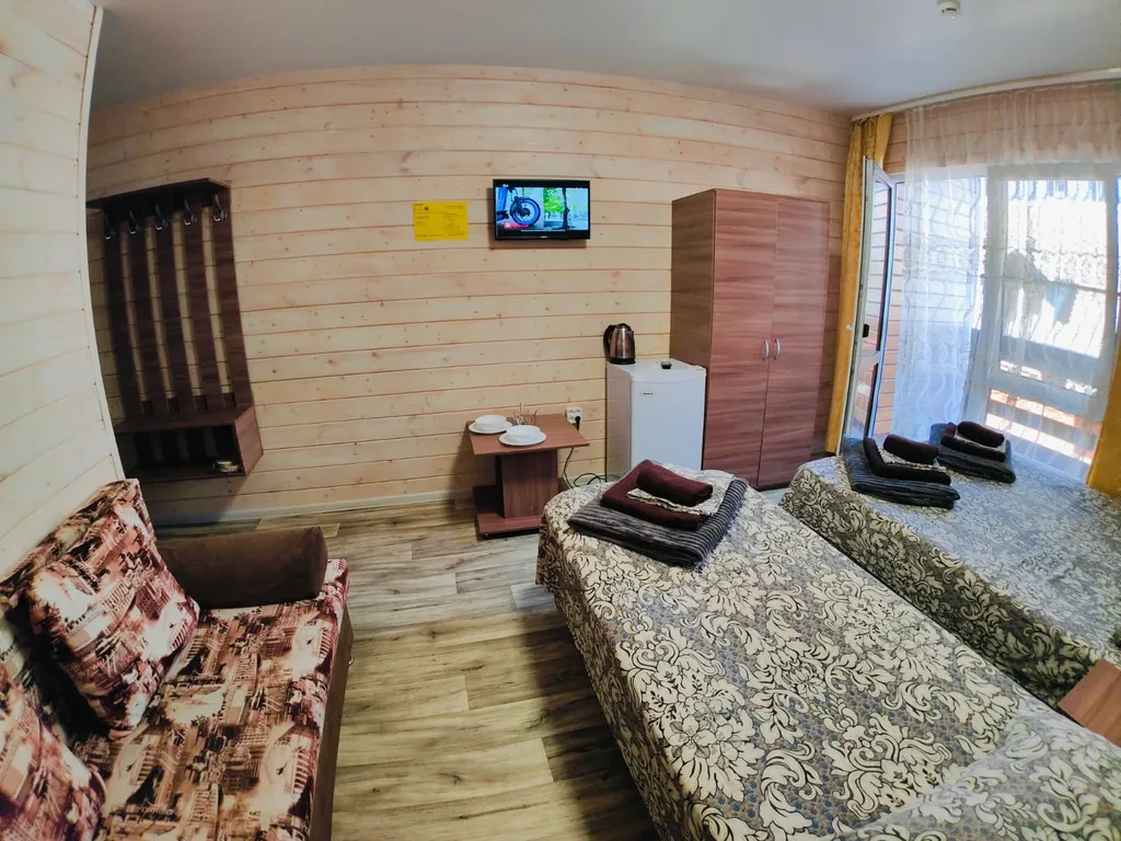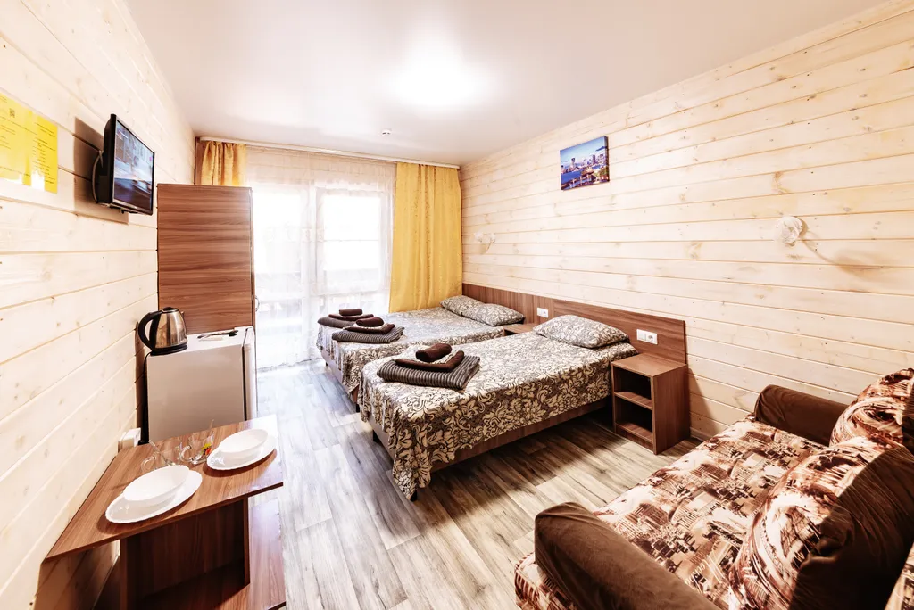 В номере есть всё необходимое: двухспальная кровать 1, 4 м, односпальная кровать 80 см и диван - кровать 1. 4 м, шкаф, прикроватная тумба, письменный стол, tv, холодильник, сплит - система, фен, чайник, набор посуды, набор полотенец, совмещённый санузел и косметика для ванны. В стоимость номера включено: бассейн с подогревом 4*8 с детской зоной, шезлонги, зона барбекю и столики, детская площадка, анимация для детей- летом, wi-fi, кухни для самостоятельного приготовления.