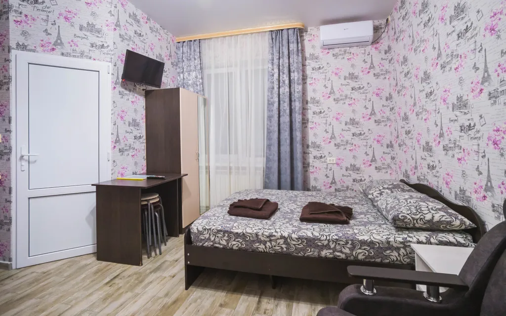 В номере есть все необходимое: кухонная зона, двухспальная кровать 1,4 м и диван- кровать 1.4 м, шкаф, прикроватная тумба, стол, TV, холодильник,сплит - система, фен,чайник, микроволновая печь,варочная панель,набор посуды ,набор полотенец, совмещённый санузел и косметика для ванны. В стоимость номера включено: бассейн с подогревом 4*8 с детской зоной, шезлонги, зона барбекю и столики, детская площадка, анимация для детей-летом, Wi-Fi, кухни для самостоятельного приготовления.