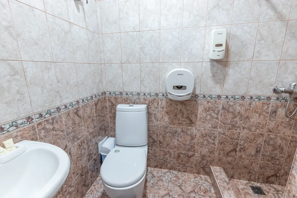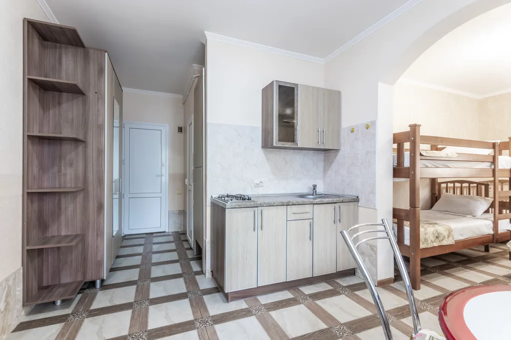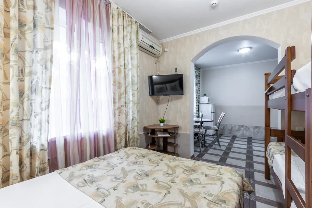 В номере: Двуспальная кровать, двухъярусная кровать, шкаф, зеркало, ТВ, кондиционер, кухня, посуда, стол, стулья, варочная поверхность, микроволновка, холодильник, чайник. Совмещённый душ, туалет, полотенца все кроме пляжных, постельное белье, фен.Окна выходят во внутренний двор. Уборка 1 раз в 3 дня. Смена полотенец 1 раз в 3 дня. Смена постельного белья 1 раз в 5 дней.