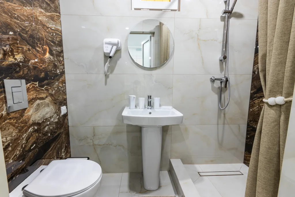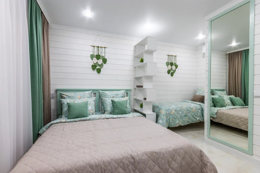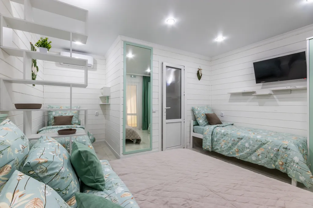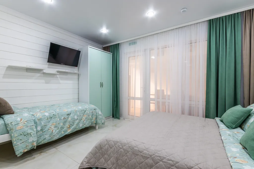 В номере: Двуспальная кровать и две односпальные кровати, зеркало, шкаф, телевизор, кондиционер, холодильник, чайник с мелкой посудой. Кухонная зона с варочной поверхностью, микроволновая печь, стиральная машина, столовые приборы. Совмещенный душ, туалет, полотенца все кроме пляжных, постельное белье, фен. Мыло, гель для душа, шампунь - в дозаторах, халаты. Окна выходят во внутренний двор. Уборка, смена полотенец 1 раз в 3 дня. Смена постельного белья 1 раз в 5 дней.