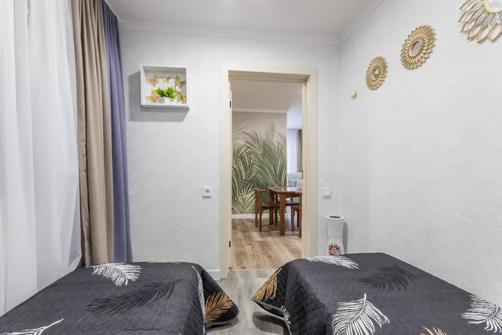 В номере: Две двуспальные кровати, двуспальный диван и две односпальные кровати, зеркало, шкаф, тумба, ТВ, кондиционер, кухня, большой двухкамерный холодильник, чайник, варочная поверхность, микроволновая печь, набор посуды, стиральная машина, совмещенный душ, туалет, полотенца все кроме пляжных, постельное белье, мыльные принадлежности, халаты и тапочки, фен. Окна выходят во внутренний двор.