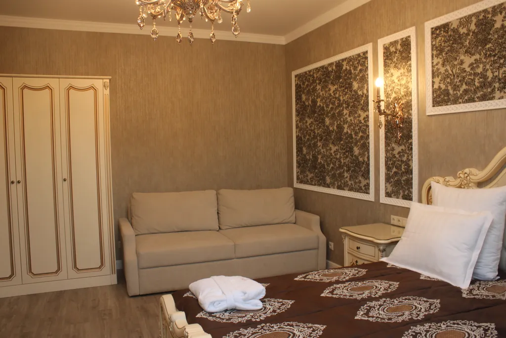 Комфортабельные 2х-комнатные апартаменты площадью 45 м² - это номер высшей категории. Оборудованная обеденным столом и мягким диваном гостиная зона располагает к приятному времяпрепровождению. Кухонная зона с посудой, индукционной плитой, микроволновой печью, раковиной, электрическим чайником позволяет готовить пищу в удобное для вас время.