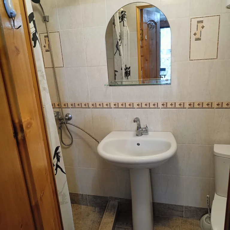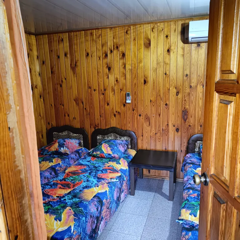 Своя веранда, кухонная и обеденная зона, душ, туалет. В каждой комнате кондиционеры и телевизор. В первой комнате три односпальные кровати, во второй комнате три односпальные кровати.